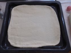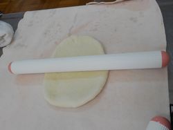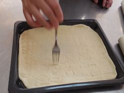 | 生地を裏返して伸す | オリーブ油を塗って生地をおく | フォークで穴をあける |