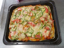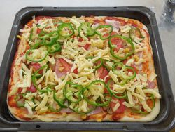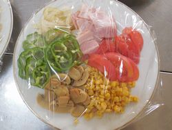 | ピザの具、チーズは1枚100g | ピザソースを塗って… | トッピング | 焼き上がり |