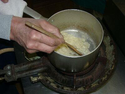 ![]() 厚手の鍋で1.を丁寧に(1時間位) 焦がさないように炒める |