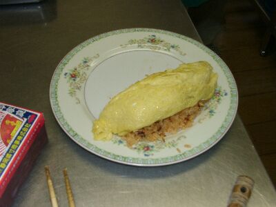 ![]() ピラフを盛りその上にオムレツ型にした卵を乗せる |