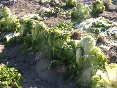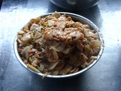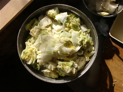 | 最近の冷え込みで畑の白菜が萎れてきてしまっている。早めにキムチを作らねばと12月24日4つ切りにして一日天日干し。 | 天日で干した白菜を塩で押す。ポリ容器に一杯あった白菜が重石を1日乗せて置く事で半減した。 | 12月25日、塩を洗って水を切った。これで白菜10個分。 | 水を切った白菜を食べやすい大きさにカット。白菜が甘い。 |
