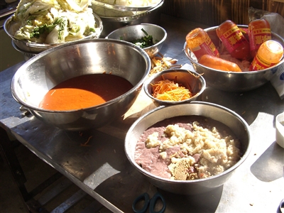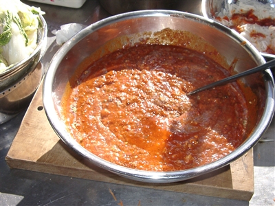 | 今回も手抜きのたれ、ベースはキムチの素を使った。ニラ、人参、大根を千切りにし、ピーナッツ、だし昆布、りんご、にんにく、イカの塩辛をフードプロセッサーで細かくした。 | それらを合わせたのが上の写真。昔、料理屋をやっていたおばあさんが教えてくれた、門外不出のレシピ。 | たれと白菜を混ぜて出来上がり。このキムチを食べていると市販の物は食べられない。 | 出来上がってから母の実家へもお裾分け。 行く途中富士山の夕焼け。 |