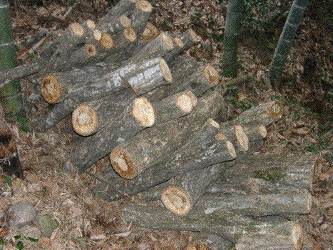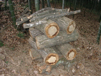 植林の邪魔になるので、昨秋このクヌギを切り倒した。 このまま朽ちさせるのは勿体無いので椎茸を作ろうと いう事になり、昨日菌入れをした。 椎茸がたくさん出てくれる事を祈りながらの作業だった。 来年の秋には初物ができるはずだ。 |