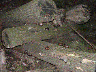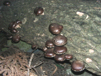 十数年前に菌入れをした原木、まだ現役だ。 | が、もう限界、来年まで持つかどうかの状態。新しい原木を楽しみに待つしかない。 |