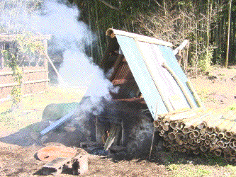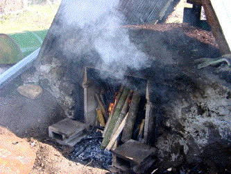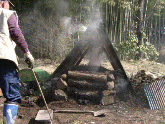 この釜の大きさで6時間燃焼、煙りが透明になって来たら煙突と入り口を密閉して一気に消火。2〜3日放置、しっかり冷ましてから取り出すそうです。一度見ただけでは竹炭を焼く事が出来ないので、今度実際に炭焼きをさせてもらう事にしました。