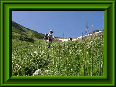 岩苔乗越が近付くにつれ傾斜がきつくなるが、花を眺めながらの歩きで苦にはならなかった。岩苔乗越に出て少し