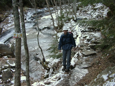 最初は落ち葉でふかふかした林道だったが、あちこちに雪が見え、すぐにザクザクと霜柱が音を立てる道となった。