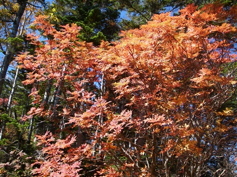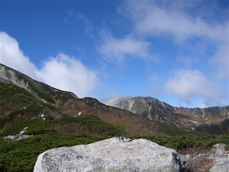 宝剣山荘から下り始めると風で霧が飛ばされ晴れ間が出始めた。風は相変わらず。