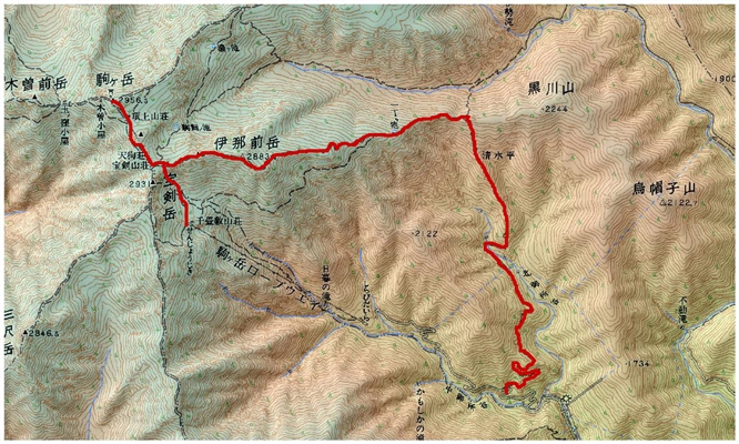 10月08日 7:15山荘→ 7:55駒ケ岳山頂8:05→ 8:55宝剣山荘9:05→ 10:20七合目10:30
