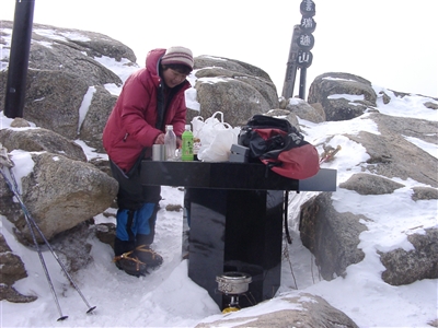 しかし、軽いものは強風に飛ばされてしまう。コンロも下に置いて火を点けた。