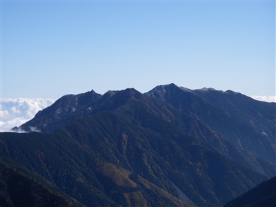 後ろから甲斐駒が迫っている。甲斐駒の右手に富士山、北岳、間ノ岳、塩見、