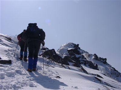 中山峠を過ぎると強風、顔や耳が痛くなるほどの冷たさだ。毛糸の帽子に替えて顔の露出部分を少なくして歩いた。