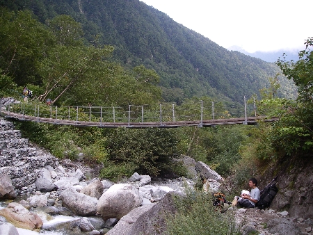 横尾から1時間ほどで本谷橋。ここで昼食にした。