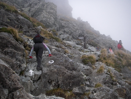 南稜へ出るハシゴの手前、若い女性に頭へ包帯を巻いてもらっている人がいた。
