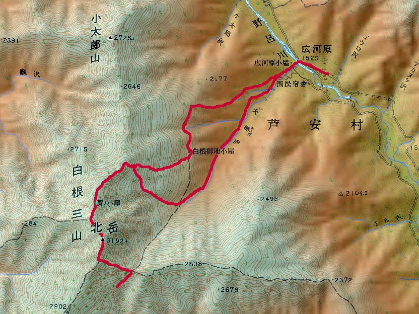 広河原山荘分岐→ 14:00広河原駐車場16:00→ 16:40芦安市営駐車場→