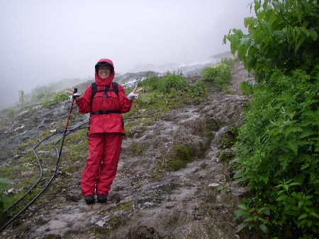 しばらくは川になった登山道を下ったが、そのうち雨具を着けないで登って来る人とすれ違うようになり