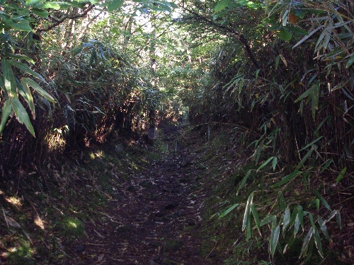 両側に背丈以上もある大きなスズタケが茂る登山歩道。