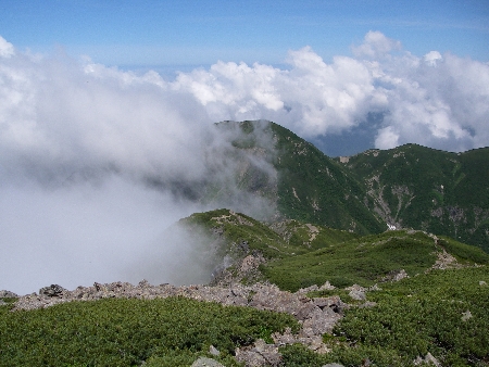 聖岳を下り始めるとガスが出てきた。