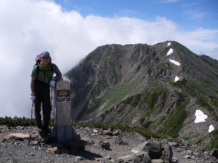 赤石岳山頂着8:35。写真を撮ったりコーヒーを沸かしたり、周りの景色を楽しみながら1時間弱の休憩。