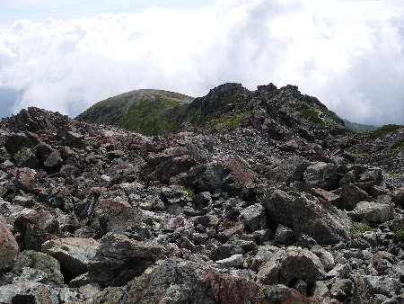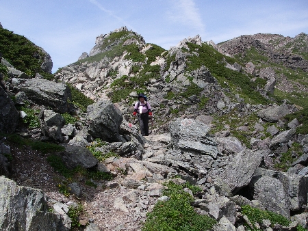ゴロゴロした石の道を下ると丸い山頂の丸山へ着く。