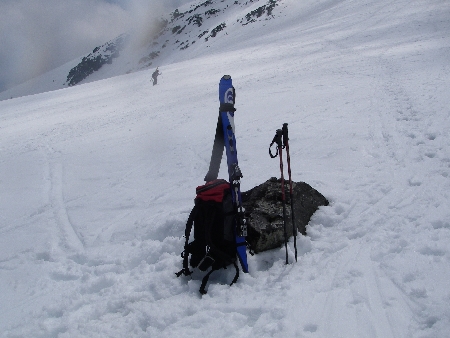 | スキー板を背負って登る、少数派 | 大雪渓で休憩 |