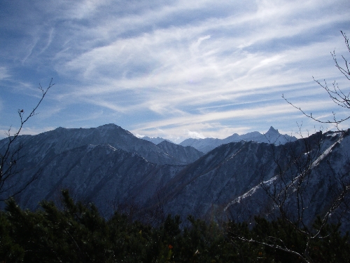南側には富士山と甲斐駒・北岳・千丈、その西に今夏歩いた南アルプス南部の山々が見えた。
