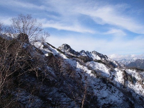 餓鬼岳の北側に真っ白に雪を被った鹿島槍が見える。