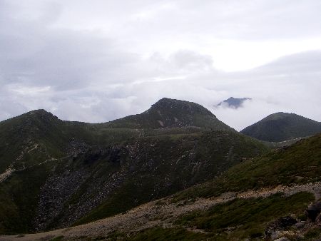 久住わかれからの天狗ヶ城と中岳(中央)
