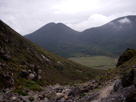 法華院への下り、正面は平治岳
