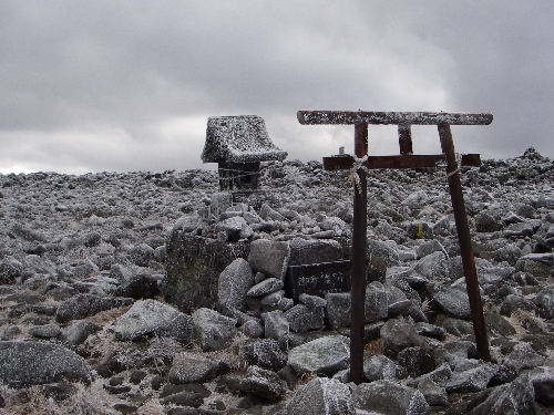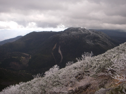 それほど急でない登山道はほとんど直登、その道が左に折れる所が前掛山の分岐。 少し下ってからほぼ水平な登山道を少し歩くと蓼科山荘のある将軍平に着いた。 将軍平からは大きな石がゴロゴロしている登山道で非常に歩きにくい。 登山道の脇が針葉樹から広葉樹に変わると見事な樹氷、 この頃になると空は暗かったが頂上付近の霧はなくなった。