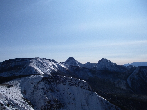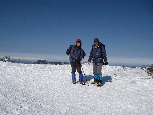林の中はルートの木の枝に赤い布を巻き付けてあったが、 石に書かれた白い丸印は雪に埋もれてしまっている。 そのため、最後の登りは何本かのルートが付けられてしまい ハイマツや石楠花が踏みつけられてしまっていた。 西天狗11:50着。