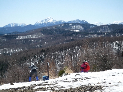 暖かい一日で歩き始めるとすぐに汗ばんで来た。上着を脱いだが手袋は冬用、機能性タイツも冬用で ちょっと失敗したかな?と思う。その分休憩を増やして汗で濡れないように歩くしかない。 沢入駐車場から1時間ちょっとで入笠湿原、ここで富士見パノラマスキー場のゴンドラリフトから登って来た 人たちと合流して人が増える。