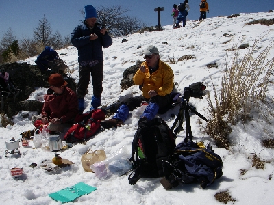 一旦林道へ出てそれから尾根を登る。尾根を登り始めると風が出て 雪がクラスト気味、ヤッケを着てアイゼンを着けた。 最後の急登を経て入笠山山頂着11:30。 頂上では時折強い風が吹いたが風下の斜面を探して昼食、 稲荷寿司を頬張りながら湯を沸かしてカップラーメンとコーヒー。