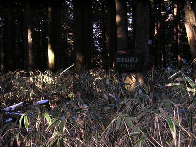 山頂は熊笹が地面を覆い大きな杉・桧で周りの景色は何も見えない。