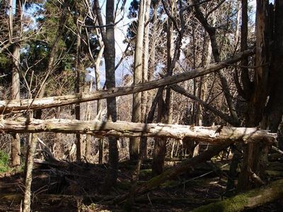 台風で倒された木々が横たわり雑木が成長しているので倒木を