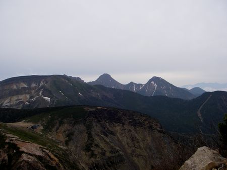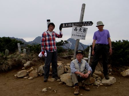 13:30西天狗岳着。今日の天気予報は曇り、雨さえ降らなければと思って 来たのだが予想以上に遠望が利く。「梅雨時にしては上出来だね」と写真を撮った。 ここ1年以上ほとんど自転車に乗らず、足の筋肉が落ちて足が細くなっている。 何時間も歩けるだろうかと多少の不安もあったが何とかここまで来れた。