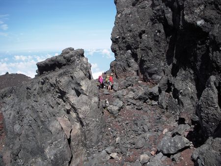 大沢崩れの上を過ぎた辺りから内回りのコースから外れ外回りのコースを白山岳に向かう。 大きな声では言えないが崩落が激しく現在は立ち入り禁止になっているコース。 崩れやすいガレ場をかすかな踏み跡を探しながら歩き、約1時間かけて白山岳山頂(3756m)。 登ってくる人もなく剣が峰の喧騒が嘘のように静か。