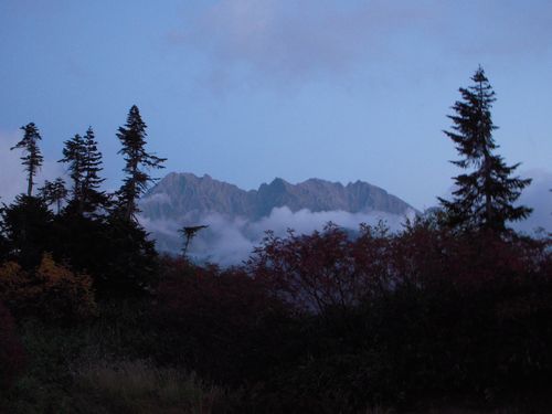 布団に入って休んでいると「穂高が見えるよ」との声が聞こえた。日暮れ時、
