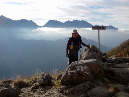 鏡平から1時間で弓折乗越、鏡平山荘へ泊まった人達が双六へ行く人と笠ヶ岳へ行く人に分かれる。