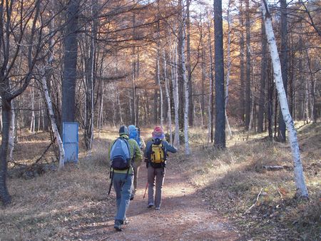 駐車場出発は予定より少し遅れて8:20、落ち葉を踏みながら歩いた。