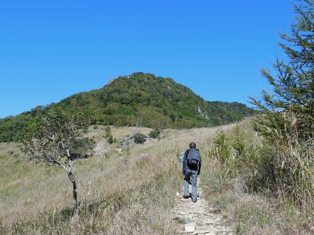 とても良い天気で南アルプスなどもくっきり見える。更に進むとススキの原にある月見岩に出た。