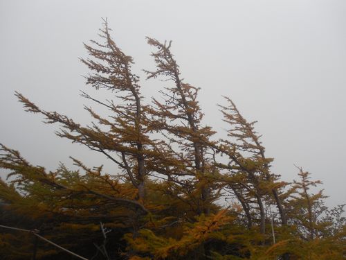 五合目付近は黄葉が真っ盛り、朝日を浴びた黄葉も良かったが霧雨で濡れた黄葉も