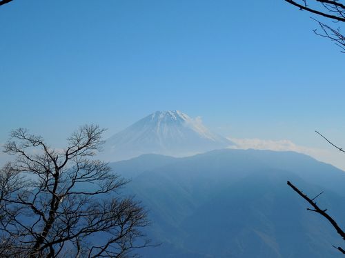 落葉した雑木林を歩いていると木々の間から富士山が見えている。