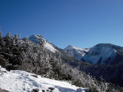 針葉樹の林の中は薄暗かったのだが樹の背丈が低くなると真っ青な空の面積が急に 広くなった。南アルプス、中央アルプス、御岳、北アルプスの山々がくっきり見えた。 予報で冬型の気圧配置と言っていたので日本海側は見えないだろうと思っていたが 雨飾、火打、妙高などの山々も見えていた。腹が減ってきたので第一展望台でパンを 食べテルモスの湯を飲んだ。 |